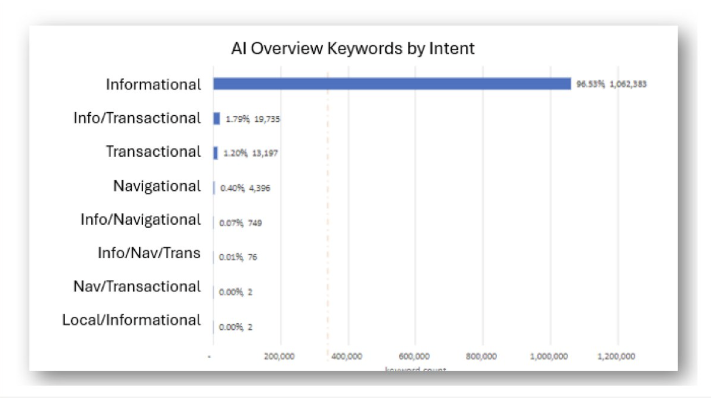 Bu grafik, AI Overview sonuçlarının hangi arama niyetlerinde (search intent) yoğunlaştığını göstermektedir. Verilere göre AI Overview tetiklenen sorguların büyük çoğunluğu bilgi amaçlı (informational) aramalardan oluşmaktadır.