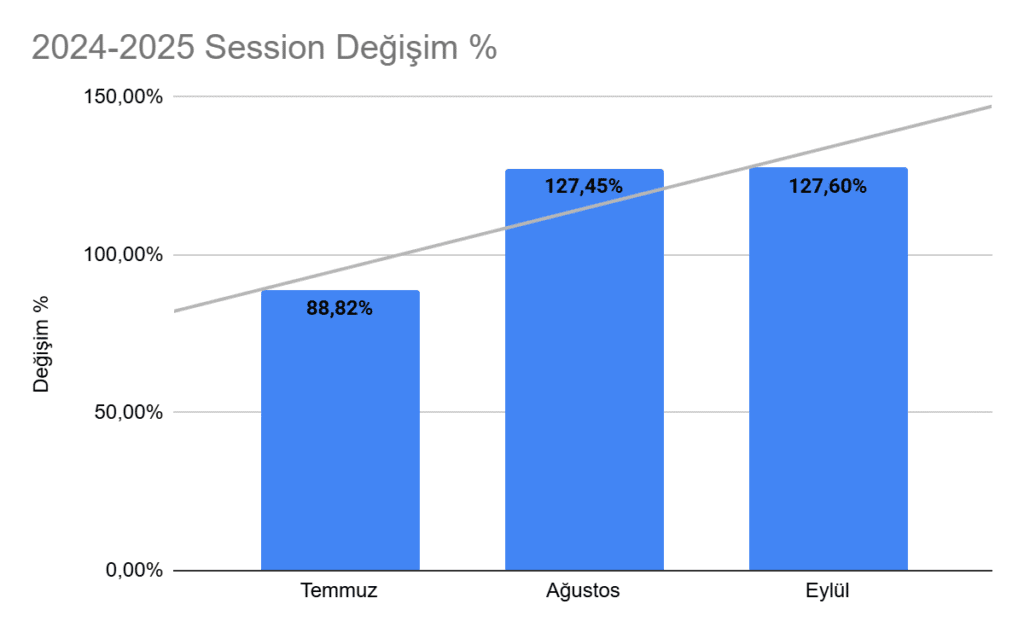 Sessions tarafında Temmuz ayında geçen yıla paralel bir performans sergilenirken, Ağustos ve Eylül aylarında elde edilen trafik artışı hem marka görünürlüğüne hem de satışa dönüşen etkileşimlere önemli katkı sağlamıştır. Bu artış, kampanya kurgusunun daha odaklı hale getirilmesi ve doğru kitlelere yönelik stratejilerin uygulanması ile desteklenmiştir.