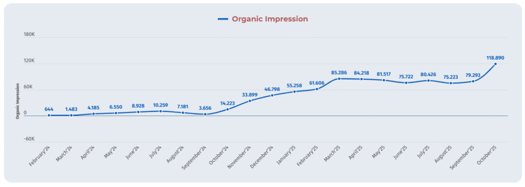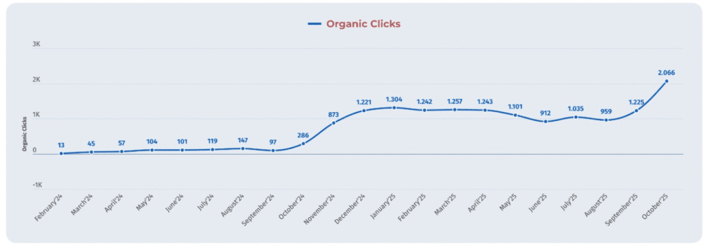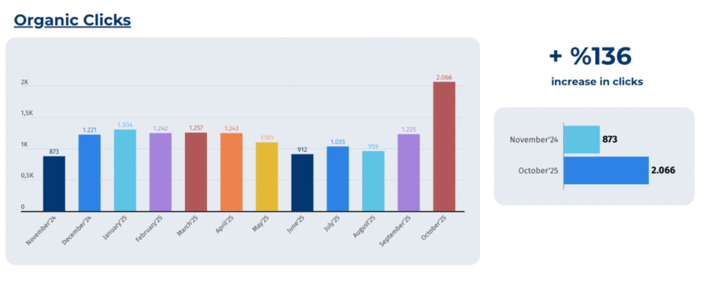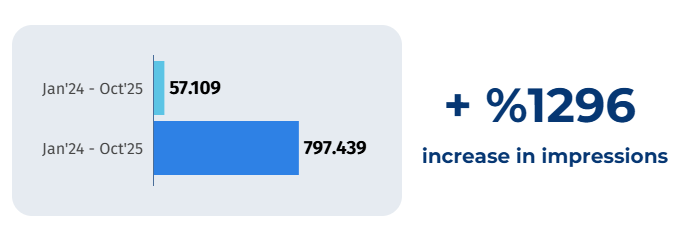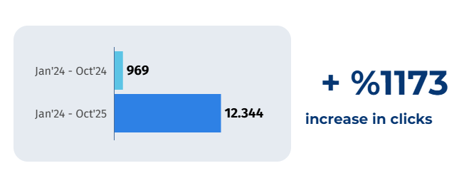 Şubat 2024’te 13 olan tıklama, Ekim 2025’te 2.066 seviyesine ulaştı. Bu, proje dönemi boyunca sürdürülebilir ve kesintisiz bir görünürlük artışı sağlandığını kanıtlamaktadır.