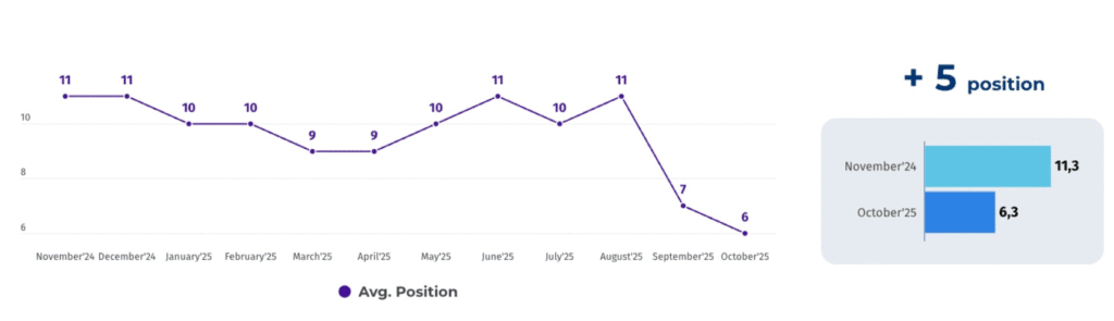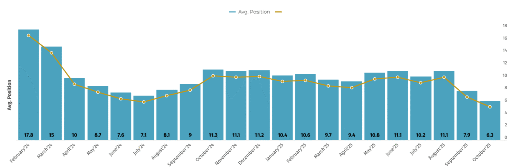 Ekim 2025’te ortalama pozisyonun 6.3’e kadar iyileşmesi, çok sayıda anahtar kelimenin ilk sayfa – hatta ilk 5 konuma taşındığını göstermektedir.